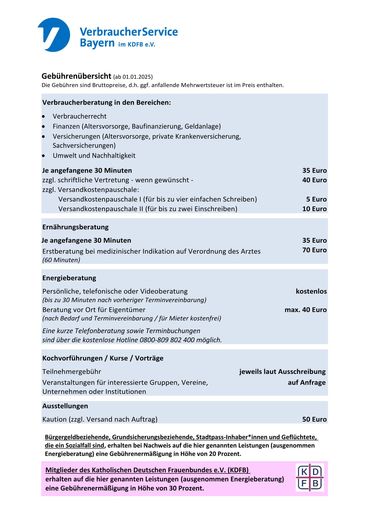 Der VerbraucherService Bayern im KDFB e.V. steht für eine anbieterunabhängige Verbraucheraufklärung und nachhaltige Verbraucherbildung.