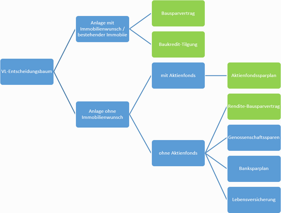 Die häufigsten VL-Sparformen sind der Bausparvertrag, der Fondssparplan und der Banksparplan. Eine erste Orientierung über sämtliche vom Staat mit Zulagen geförderte (grün) und nicht geförderte VL-Anlagemöglichkeiten gibt der nachstehende Entscheidungsbaum.
