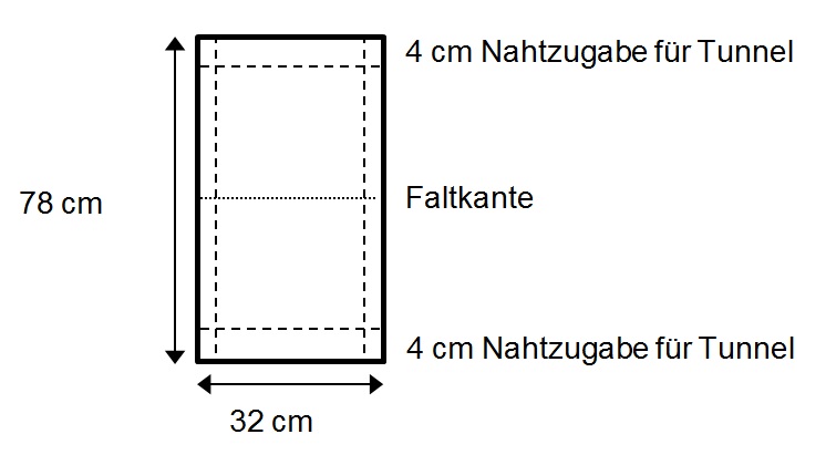 Stoffbahn aufeinanderlegen. Links und rechts einen 1 cm breiten Saum absteppen, dabei oben für das Einziehen des Bandes in der Mitte des Tunnels 1-2 cm offen lassen. Seitenränder mit Zick-Zackstich versäumen.