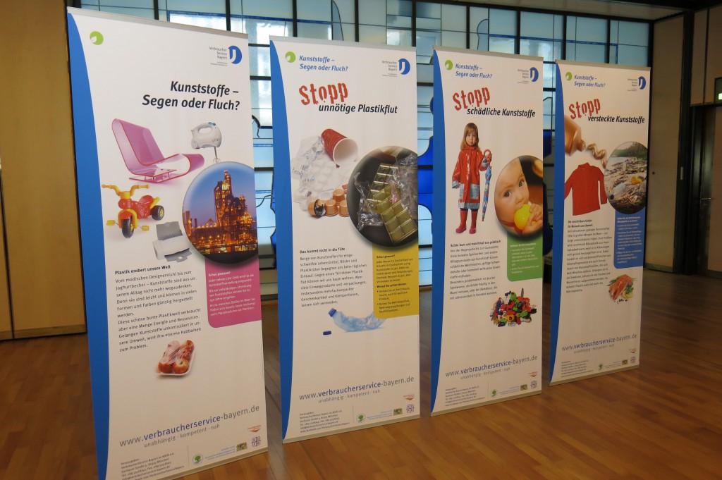 Die Bannerausstellung „Kunststoffe – Segen oder Fluch?“ sowie die Plakate "Plastikmüll vermeiden" und "Getränkeverpackungen" können in den Beratungsstellen des VerbraucherService Bayern gegen eine Kaution von 50 Euro und ggf. Portokosten ausgeliehen werden.