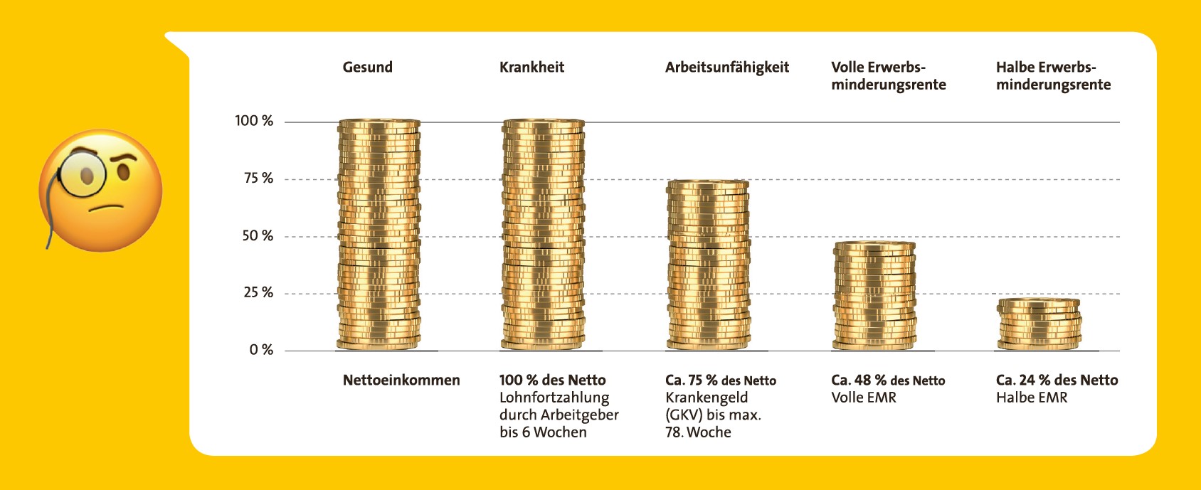 Die eigene Arbeitskraft ist ein Vermögen wert. Im Laufe eines Berufslebens verdienen Menschen in Deutschland mit einer Berufsausbildung durchschnittlich etwa 1,3 Millionen Euro, mit Hochschulabschluss sogar rund 2,3 Millionen Euro. Doch etwa jeder dritte Arbeiter und jeder vierte Angestellte scheidet vor dem regulären Renteneintrittsalters gesundheitsbedingt aus der Arbeitswelt aus. Durch die Sozialversicherung ist geschützt, wer bestimmte Bedingungen erfüllt, 2019 erhielten knapp 1,82 Millionen Versicherte eine gesetzliche Erwerbsminderungsrente. Die Rentenhöhe betrug durchschnittlich rund 835 Euro im Monat, ein Großteil der Rentenempfänger liegt unter diesem Wert.