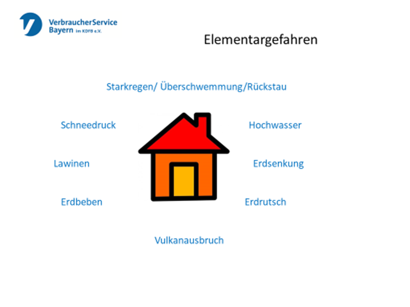 Naturereignisse wie Starkregen und Überschwemmungen nehmen zu. Die aktuellen Ereignisse zeigen deutlich, dass hierdurch häufig elementare, existenzbedrohende Schäden an Immobilien entstehen. Hauseigentümer sind mehr denn je in der Pflicht, eigenverantwortlich für den passenden Versicherungsschutz zu sorgen. Der VerbraucherService Bayern fordert von der Politik Unterstützung durch eine allgemeingültige Verpflichtung, Wohngebäude gegen Elementarrisiken zu versichern.