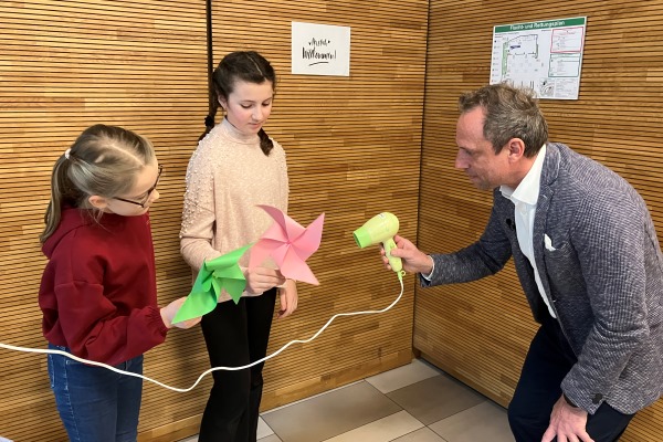 - Foto „Windenergie“: Verbraucherschutzminister Thorsten Glauber und zwei Schülerinnen beim Windenergie-Experiment