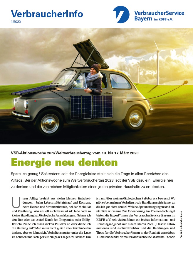 Unser Alltag besteht aus vielen kleinen Entscheidungen – beim Lebensmitteleinkauf und Konsum, beim Heizen und Stromverbrauch, bei der Mobilität und Ernährung. Was uns oft nicht bewusst ist: Jede noch so kleine Handlung hat ökologische Auswirkungen. Nehme ich den Bus oder das Auto? Kaufe ich Biogemüse oder Billigfleisch? Ziehe ich einen dicken Pullover an oder drehe ich die Heizung auf? Man muss nicht gleich alle Gewohnheiten ändern, aber es lohnt sich, Verhaltensmuster unter die Lupe zu nehmen und sich gezielt ein paar Fragen zu stellen: Bin ich mir über meinen ökologischen Fußabdruck bewusst? Wo gibt es bei meinem Verhalten noch Handlungsspielräume, an die ich gar nicht denke? Welche Sparanstrengungen sind tatsächlich wirksam? Zur Orientierung im Themendschungel bieten die Expert*innen des VerbraucherService Bayern im KDFB e.V. seit vielen Jahren ein breites Informations- und Beratungsangebot mit einem klaren Ziel: „Unsere Informationen sind nachvollziehbar und die Beratungen und Tipps für die Verbraucher*innen in der Realität umsetzbar. Klimaschonendes Verhalten darf nicht eine abstrakte Theorie darstellen, sondern soll Teil unserer Lebenswelt sein“, bringt es Markus Latta, VSB-Fachteamleiter Finanzen und Versicherungen auf den Punkt.